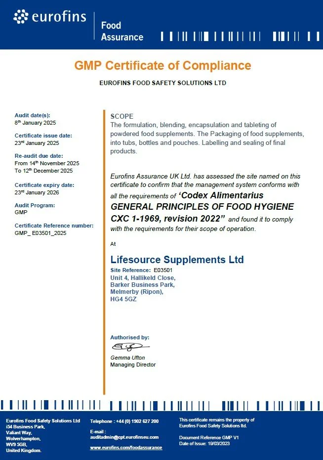 At Lifesource Supplements, we don’t just talk quality we prove it. Our facility is fully GMP certified by Eurofins, one of the world’s most trusted independent testing and certification bodies. This certification confirms our commitment to the highest standards of safety, consistency, and compliance in every product we manufacture.